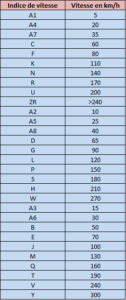 Tableau pour mieux comprendre quelle est la signification du code de vitesse des pneus